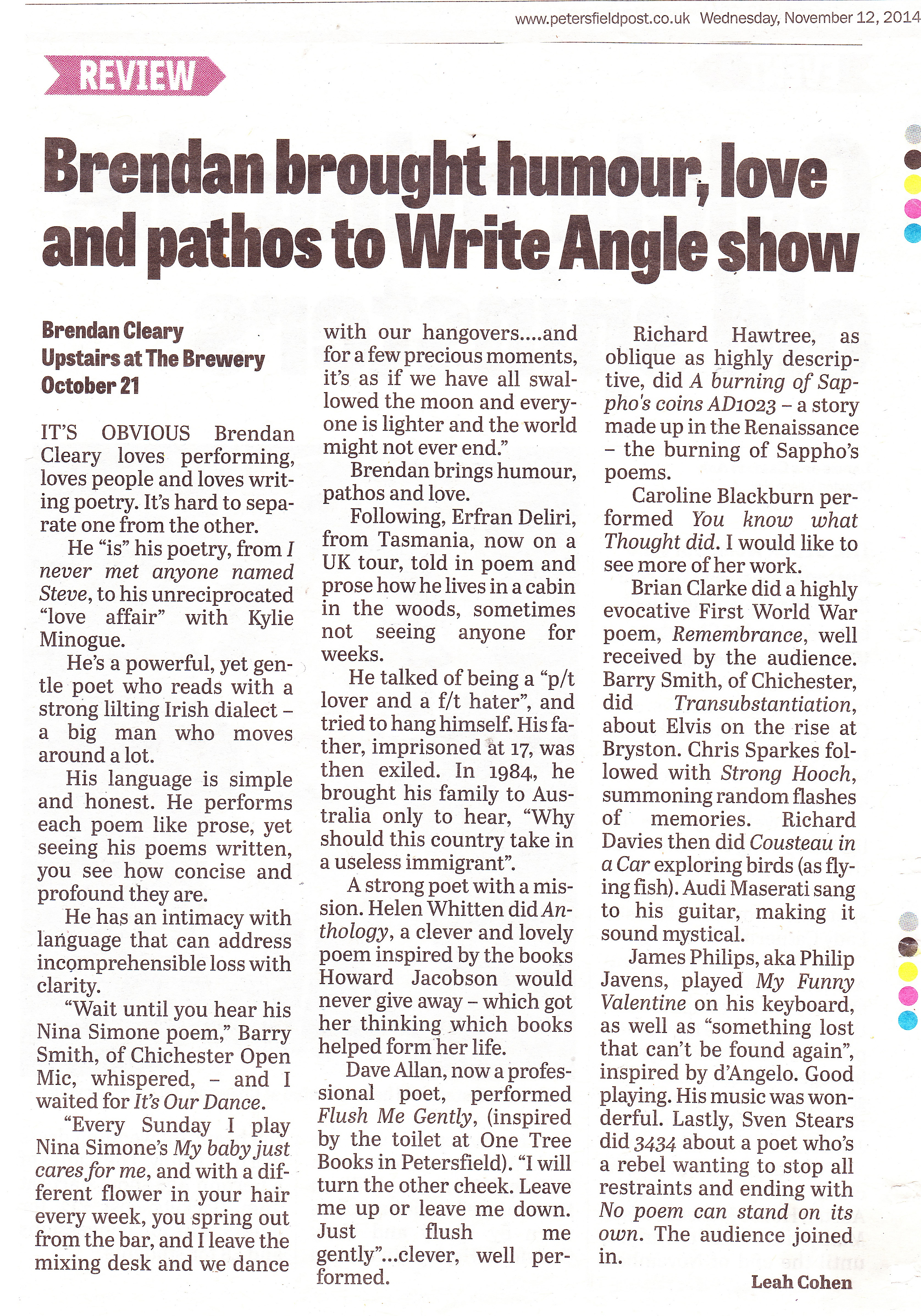 Helen read her poem Anthology at Write Angle Poetry, Petersfield, where Brendan Cleary was feature poet. Review is below:
